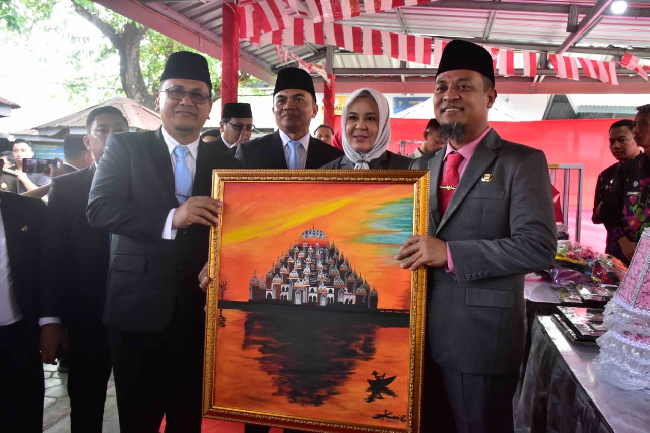 Gubernur Sulsel Andi Sudirman Sulaiman dapat hadiah lukisan Masjid 99 Kuba dari Kakanwil Ditjenpas Sulsel, Rudy Fernando Sianturi