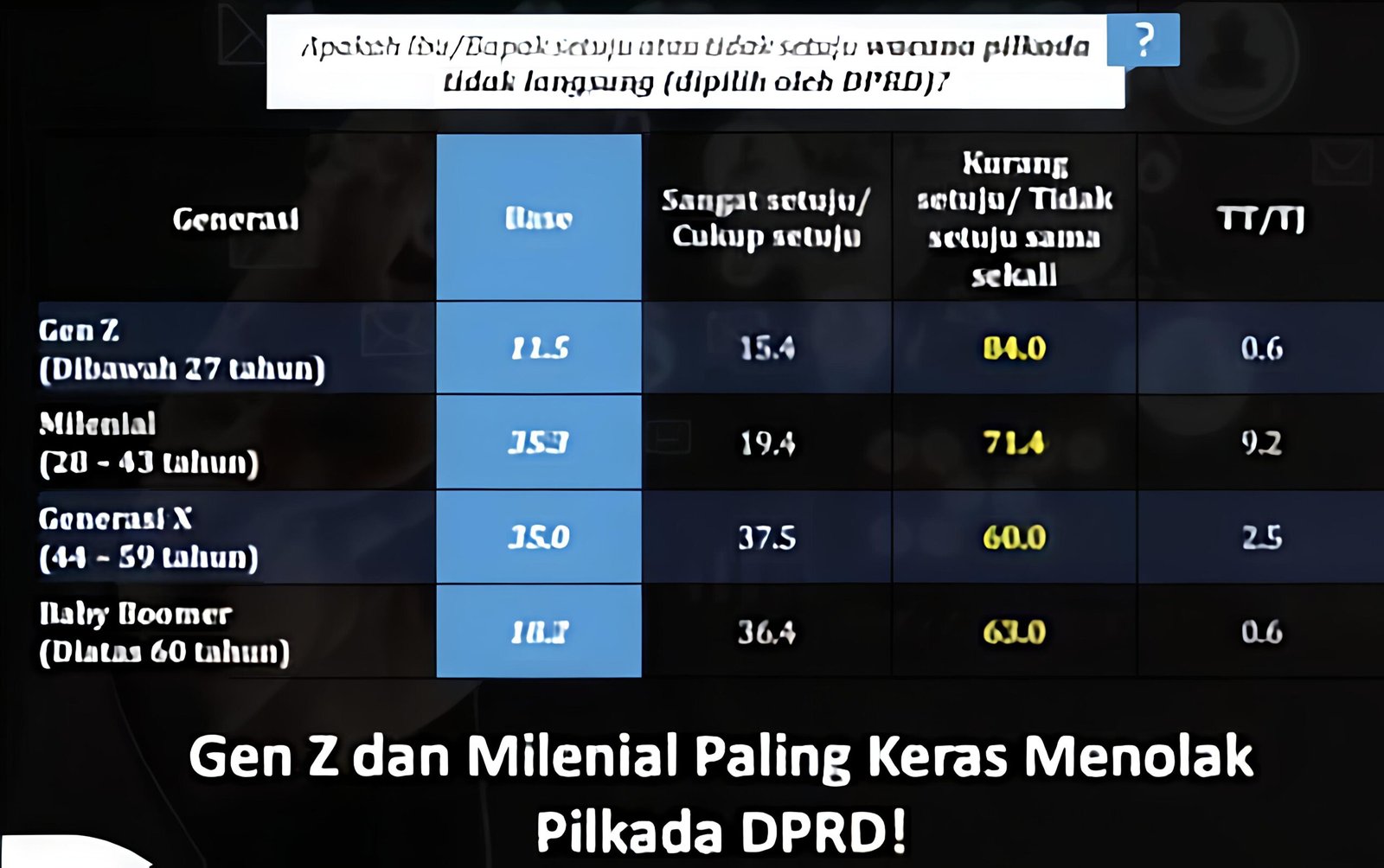 Dari survei yang dilakukan, mereka menemukan 84% Generasi Z (Gen Z) menyatakan tidak setuju, jika Pilkada dikembalikan ke DPRD.