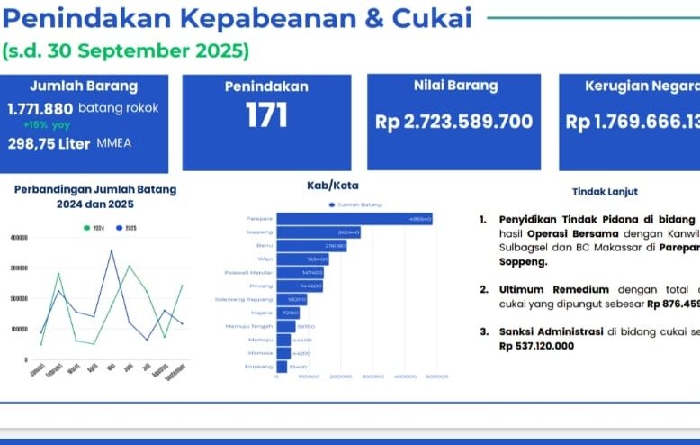 “Hingga triwulan III, telah dilakukan 171 penindakan dengan total penyitaan 1.771.880 batang rokok ilegal dan 298,75 liter minuman mengandung etil alkohol (MMEA),” ujar Dawny, Selasa (14/10/2025).