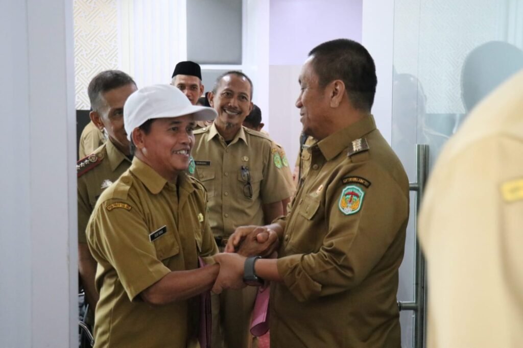 Bupati Luwu Timur, Irwan Bachri Syam berjabat tangan dengan PJ Kades yang baru dilantik beberapa waktu lalu. (Ist)