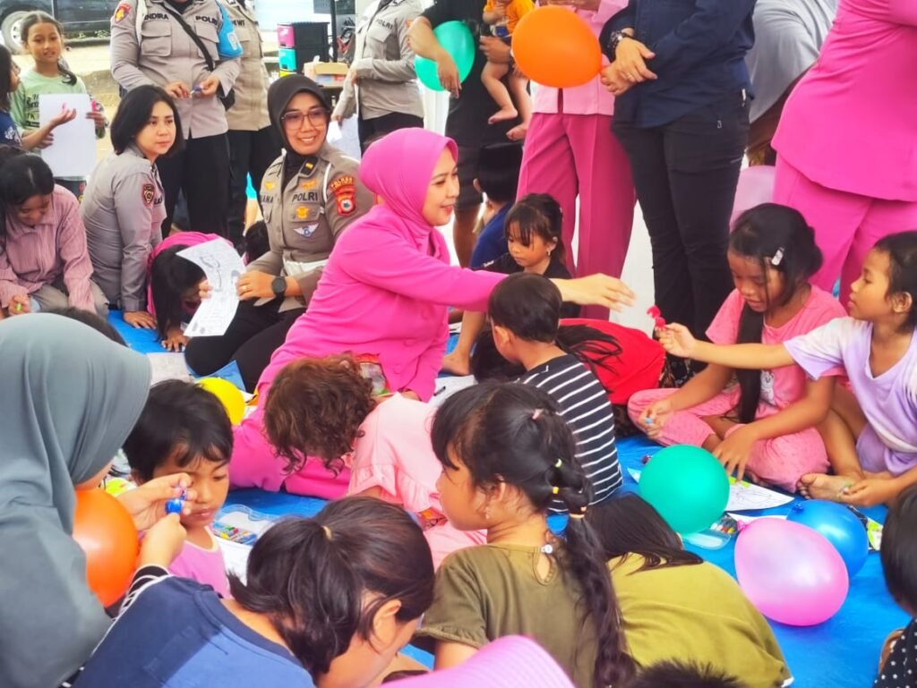 Sejumlah Polwan Polres Luwu Timur bersama ibu-ibu Bhayangkari Cabang Luwu Timur terlihat bercengkerama dengan anak-anak. Mereka mengajak anak-anak bermain, bercerita, hingga membagikan kertas mewarnai dan puzzle untuk menghibur.