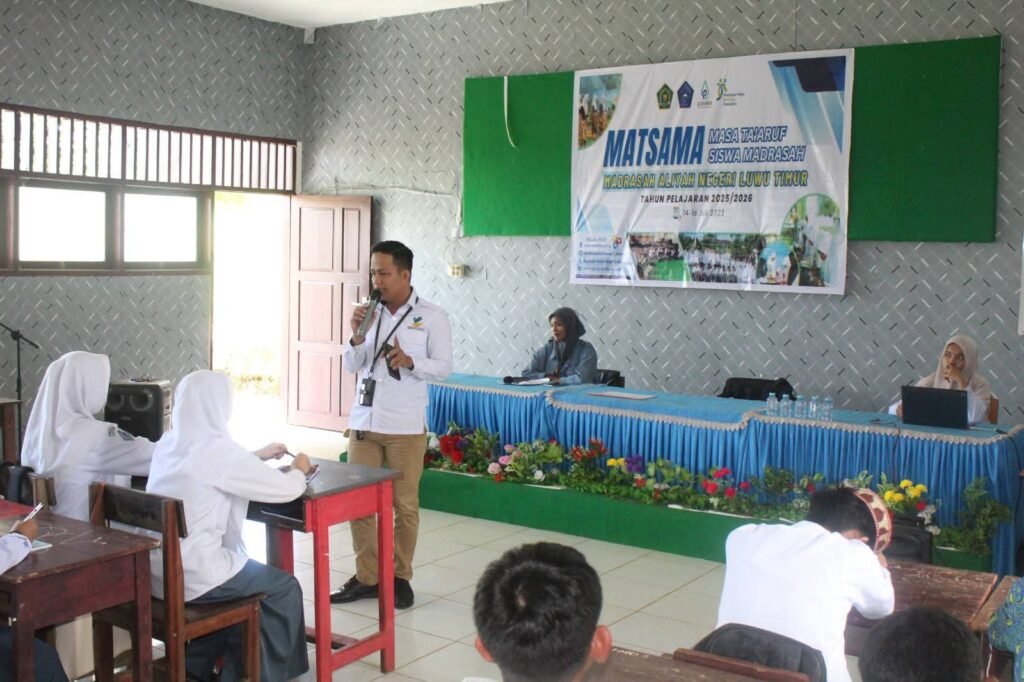 Pekerja Sosial Kementerian Sosial RI, Arbin bahas upaya pencegahan bullying di hadapan siswa siswi dalam rangkaian Masa Ta’aruf Siswa Madrasah (MATSAMA) tahun ajaran 2025/2026 berlangsung di lingkungan MAN Luwu Timur, Rabu (16/7/2025).